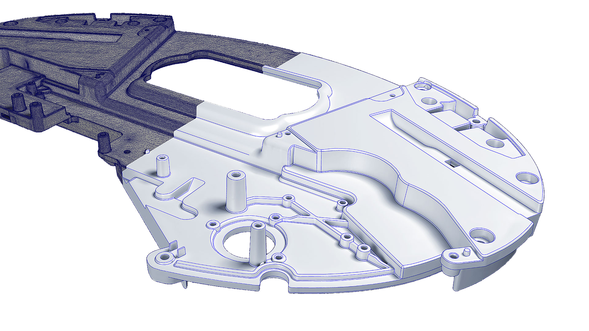 Verfahren: Die Oberfläche wird mit einem mathematischen Flächennetz „überzogen“. Jede Delle und Verformung des realen Teils bleibt exakt erhalten.